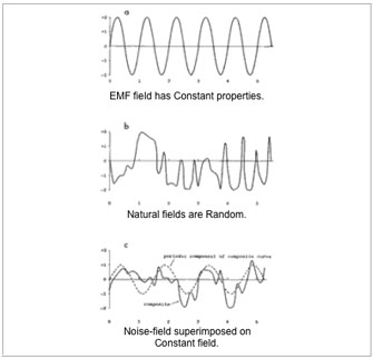 Von Menschen erzeugte elektromagnetische Felder unterscheiden sich strukturell von natürlichen Feldern, einschließlich jener subtilen niederfrequenten Felder, mit denen die Zellen unseres Körpers miteinander kommunizieren. Natürliche Felder sind ZUFÄLLIG (oder «rauschhaft») in Frequenz, Amplitude und Wellenform, wohingegen künstliche EMF REGELMÄSSIG und konstant sind. So erscheinen EMF von Mobiltelefonen als regelmäßige Mikrowellenimpulse, EMF von Monitoren als Sägezahnkurven und EMF netzbetriebener Geräte als Sinuswellen. Unsere Zellen reagieren auf solche regelmäßigen Felder negativ, geraten unter Stress und versuchen sich zu schützen.