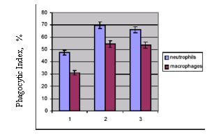 Abb. 3A: Phagozytose‑Index von Neutrophilen und Makrophagen in zwei Wochen des Experiments (Objekt der Phagozytose - Staphylococcus aureus): 1 — Kontrollgruppe; 2 — Mäuse auf MRET Wasser (präventiv für 4 Wochen); 3 — Mäuse auf MRET Wasser (präventiv für 2 Wochen).