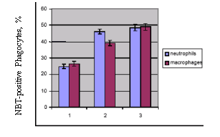 Abb. 3B: Phagozytose‑Zahl von Neutrophilen und Makrophagen in zwei Wochen des Experiments (Objekt der Phagozytose — Staphylococcus aureus): 1 — Kontrollgruppe; 2 — Mäuse auf MRET Wasser (präventiv für 4 Wochen); 3 — Mäuse auf MRET Wasser (präventiv für 2 Wochen).