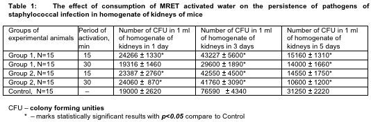 Die signifikanten schützenden Eigenschaften von MRET Wasser wurden durch eine substantielle Abnahme von Staphylococcus CFU (koloniebildende Einheiten) in Homogenat von Nieren von Mäusen auf MRET Wasser im Vergleich zur Kontrollgruppe von Mäusen nach der intra‑peritonealen Staphylokokken‑Infektion nach den ersten 24 Stunden bestätigt. Die Analyse der Daten zu Beginn der Experimente führt zu der Schlussfolgerung, dass die signifikante Abnahme der Pathogenkolonien in Homogenat von Nieren von Mäusen auf MRET Wasser erst nach 24 Stunden nach der Inokulation der Staphylococcus‑Kultur beginnt. Die Ergebnisse bei 30 Minuten aktiviertem Wasser waren viel besser als bei 15 Minuten aktiviertem Wasser und alle weiteren Experimente wurden mit 30 Minuten aktiviertem Wasser durchgeführt.