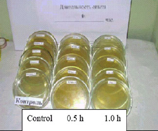 Um die Sterilität der Experimente zu verifizieren, wurden Petrischalen mit Nährmedium (MPA) ohne Staphylokokken‑Kultur dem Prozess der Aktivierung ausgesetzt und dann im Thermostaten gehalten. Es wurden keine Kolonien von Kultur beobachtet, was die Sterilität der Umgebung bestätigt.