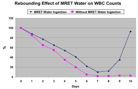 Eine klinische Beobachtung wurde an einem Patienten durchgeführt, der sich einer Chemotherapiebehandlung für metastasiertes Nasopharynxkarzinom unterzog. Regelmäßig sinken die WBC‑Zahlen normalerweise auf ein sehr niedriges Niveau. Das Wiederanstiegen der WBC von diesem niedrigen Bereich dauert etwa 3‑5 Wochen. Die Einnahme von MRET Wasser verhinderte das Absinken der WBC‑Zahlen auf ihr niedrigstes Niveau und half dabei, das prä‑Chemotherapie‑Niveau innerhalb einer ungewöhnlich kurzen Zeit von 3 Tagen wiederzuerlangen.