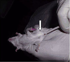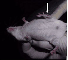 | Abb. 1: Die Ansicht der Pfoten einer Maus auf nicht‑aktiviertem Wasser (Rötung der injizierten Pfote) 24 Stunden nach der Injektion der Staphylococcus‑Kultur. | Abb. 2: Die Ansicht der Pfoten einer Maus auf MRET aktiviertem Wasser (keine Rötung der injizierten Pfote) 24 Stunden nach der Injektion der Staphylococcus‑Kultur. |