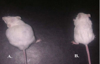 Foto: Das Erscheinungsbild von Mäusen aus «Kontroll»‑ (A) und «präventiv behandelten» Gruppen (optimale Aktivierungszeit 30 Minuten) (B) am 18. Tag nach der Inokulation von Aszites‑Ehrlich‑Karzinom‑Zellen.