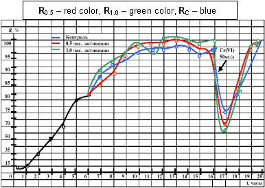 Um die Umweltbedingungen ähnlich den Bedingungen im Darm von Menschen und Tieren zu simulieren, wurde der Test der metabolischen Aktivität von mikrobiellen Assoziationen in anaerober Umgebung durchgeführt. Es wurde gefunden, dass MRET‑aktiviertes Wasser die Reduktionsaktivität von komplexen mikrobiellen Assoziationen während der ersten Stunden des Experiments substantiell erhöhte (Abb. 11).