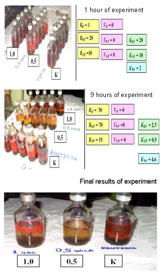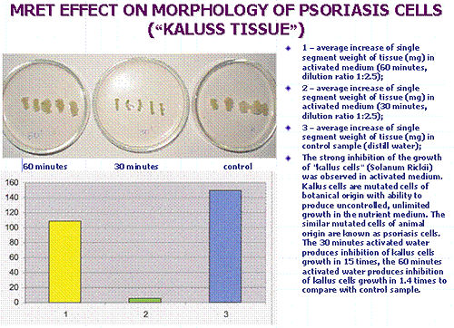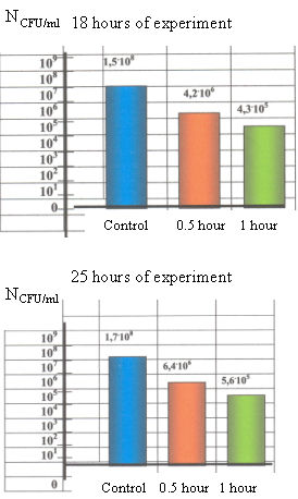 Dieses Experiment zeigt, dass der MRET‑Aktivierungsprozess einen sehr starken bakteriostatischen Effekt auf bedingt pathogene E.coli‑Mikroorganismen hat und dass die Hemmung des E.coli‑Wachstums effektiver ist, wenn die Aktivierungszeit erhöht wird. Es wurde beobachtet, dass bei niedriger Anfangskonzentration von Zellen von E.coli in Nährmedium MRET‑Aktivierung während 30 Minuten und 60 Minuten Zeitraum das Wachstum der Kultur NC/N0,5 = 27 und NC/N1,0 = 303 Mal während der 25 Stunden des Experiments hemmte. Folglich war das Niveau der bakteriostatischen Aktivität 96% in 30 Minuten aktiviertem Nährmedium und 99,7% in 60 Minuten aktiviertem Medium. Somit wurde die direkte Korrelation zwischen der bakteriostatischen Aktivität von MRET‑aktiviertem Nährmedium und der Aktivierungszeit bestätigt.
