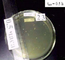 (b) MRET‑aktiviert, tact = 30 Minuten: Anzahl der Kolonien N0,5 = 6,4x106 CFU/ml. Durchschnittlicher Durchmesser der gewachsenen Kolonien d = 1,8 mm. |
