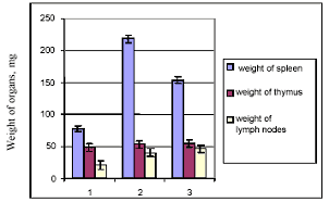 Abb. 5: Das Gewicht von lymphoiden Organen in zwei Wochen des Experiments: 1 — Kontrollgruppe; 2 — Mäuse auf MRET Wasser (präventiv für 4 Wochen); 3 — Mäuse auf MRET Wasser (präventiv für 2 Wochen).