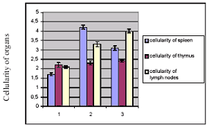 Abb. 6: Die Zellularität von lymphoiden Organen in zwei Wochen des Experiments: 1 — Kontrollgruppe; 2 — Mäuse auf MRET Wasser (präventiv für 4 Wochen); 3 — Mäuse auf MRET Wasser (präventiv für 2 Wochen).