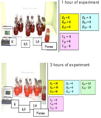 Abb. 11: Vergleichender Test der metabolischen (Reduktions‑) Aktivität von mikrobiellen Assoziationen (1,0 Stunde und 0,5 Stunde MRET‑aktiviertes Wasser und Kontrollproben) in anaerober Umgebung: R — Reduktionsaktivität (in Kontrolle, 0,5 Stunde und 1,0 Stunde MRET‑aktiviertes Wasser), K — relative Reduktionsaktivität, V — Gasvolumen in den Flaschen.