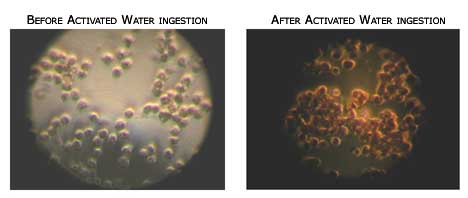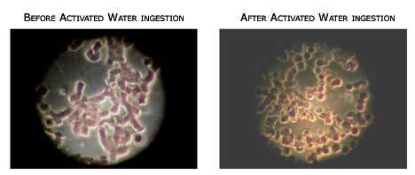 In diesem speziellen Fall zeigt die Blutprobe des Probanden vor der Einnahme von aktiviertem Wasser sogenannte Rouleau‑Bildung, wenn Blutzellen gestapelt sind und ein wurmähnliches Muster bilden. 30 Minuten später, nach der Einnahme von aktiviertem Wasser, brachen die meisten wurmähnlichen Muster auf und bildeten individuelle Muster von schön runden Kugeln.