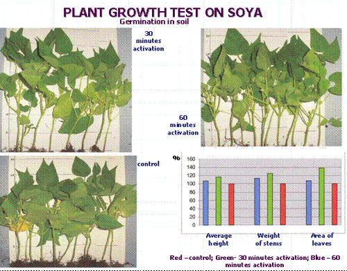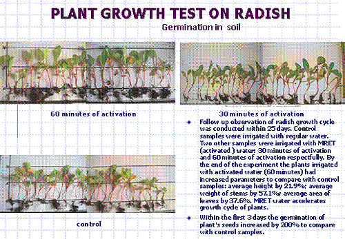 Die Untersuchungen des Einflusses von MRET aktiviertem Wasser auf Pflanzen wurden während eines 3‑Monats‑Zeitraums am Kiewer Institut für Pflanzen‑Genetik der Ukrainischen Akademie der Wissenschaften unter der Aufsicht von Prof. V. Vysotskii, Kiewer Nationale Universität durchgeführt. MRET aktiviertes Wasser beschleunigte den Prozess der Samenkeimung mehrerer Pflanzen (besonders von Kohl, Kürbis, Stangenbohnen, Gartenrettich und Erbsen) und verbesserte ihren Wachstumszyklus.