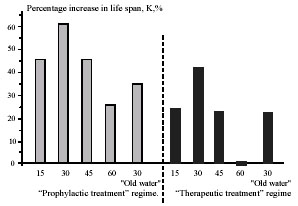 Abb. 2: Die Änderung des prozentualen Anstiegs der Lebensspanne von tumorbehafteten Mäusen mit Aszites‑Ehrlich‑Karzinom, die verschiedene Typen von MRET aktiviertem Wasser in «präventiver Behandlung» und «therapeutischer Behandlung»-Regimen erhielten. Die Ziffern unter den Diagrammen entsprechen der Dauer der Wasseraktivierung in Minuten.