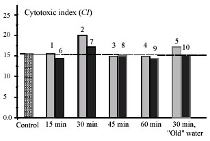 Abb. 3: Der Effekt von MRET aktiviertem Wasser auf die zytotoxische Aktivität von Lymphozyten, die NK‑Zellen enthalten. Aktiviertes Wasser wurde bei Mäusen ohne Tumoren in zwei Regimen angewandt (für 21 und 14 Tage), bezeichnet als «präventiv» (1–5) und «therapeutisch» (6–10).